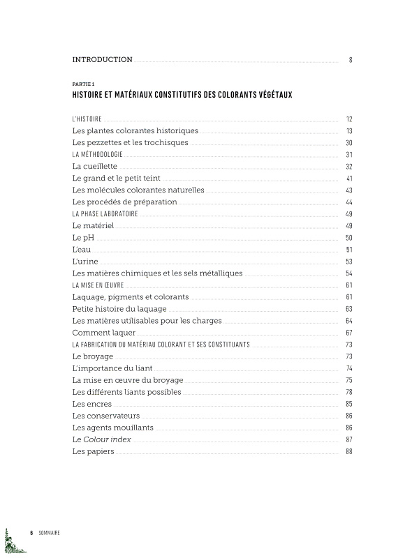 La première partie retrace l'histoire des plantes colorantes les plus célèbres, avant d'aborder les procédés de récolte, de préparation des colorants et pigments, et enfin la fabrication du matériau colorant.